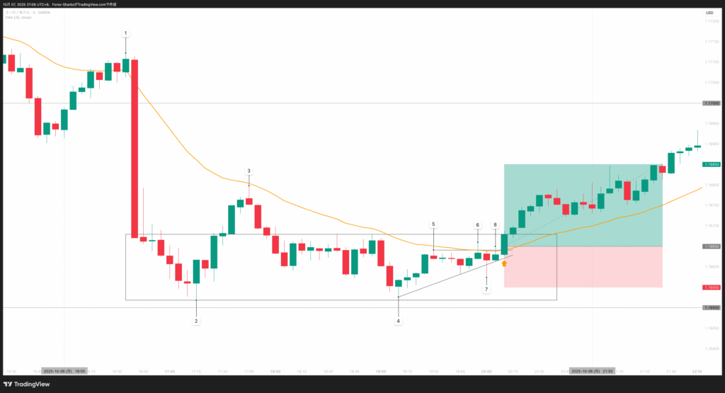 4-5のポールに5-8で上昇トライアングルを形成した。足6のブレイクはビルドアップがなくティーズブレイクとなり、足7も同様であった。足7でダマシの安値を付けたあと、25EMAとトレンドラインの間でスクイーズする足8が出来てシグナル足となった。足8の上で仕掛け、その後は1.17のマグネットに吸い込まれていき20pipsを利確した。